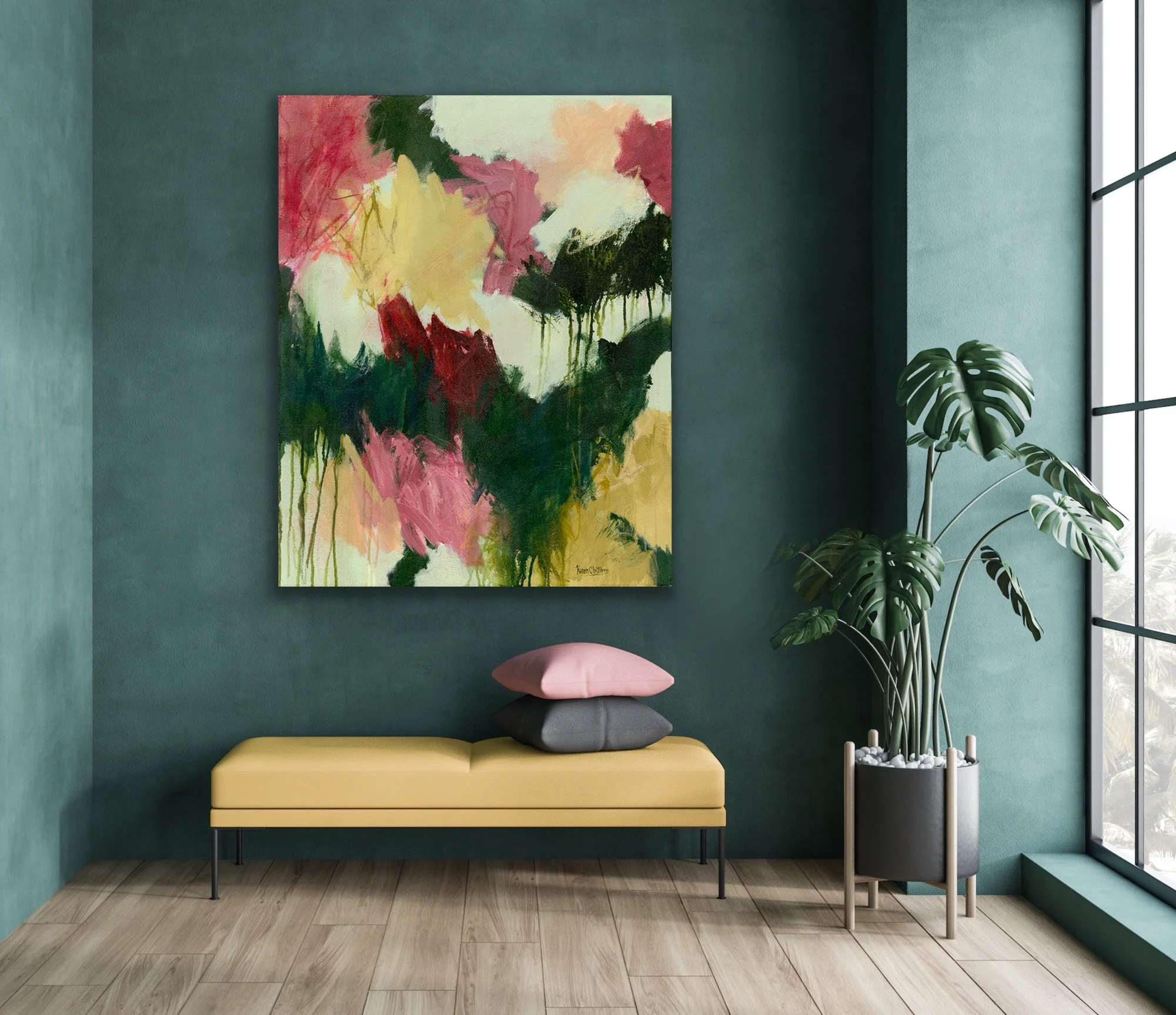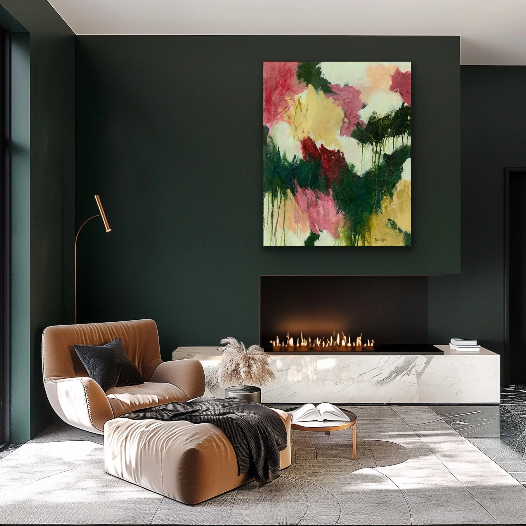 This is a medium-sized abstract painting using acrylics and mixed media on a 30” x 24” x 1.5” gallery wrapped canvas